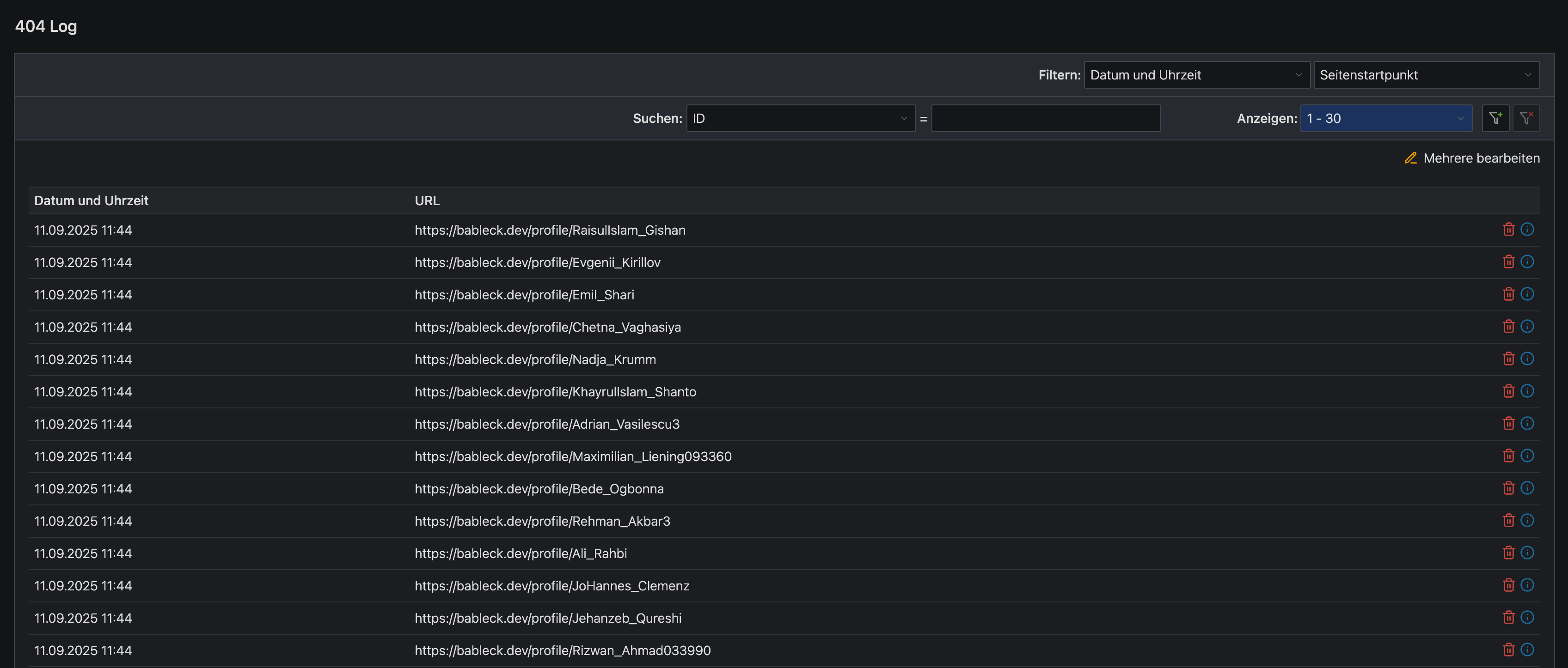 Dort kann man nach diversen Feldern filtern oder suchen und direkt Weiterleitungen für fehlerhafte URLs anlegen wenn die URL Rewrite Erweiterung von Terminal42 installiert ist.