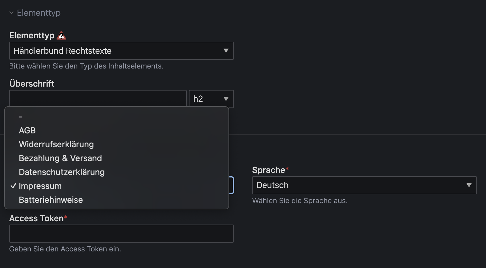 Du fügst ein Inhaltselement hinzu, wählst den Rechtstext-Typ, die Sprache und gibst deinen Händlerbund Access Token an. Die Erweiterung ruft den Text anschließend per API ab und zeigt ihn im Frontend an. Außerdem werden die Rechtstexte gecached, das heißt sollte die Händlerbund API nicht verfügbar sein, wird der Rechtstext, der zuletzt abgerufen wurde, weiterhin angezeigt.