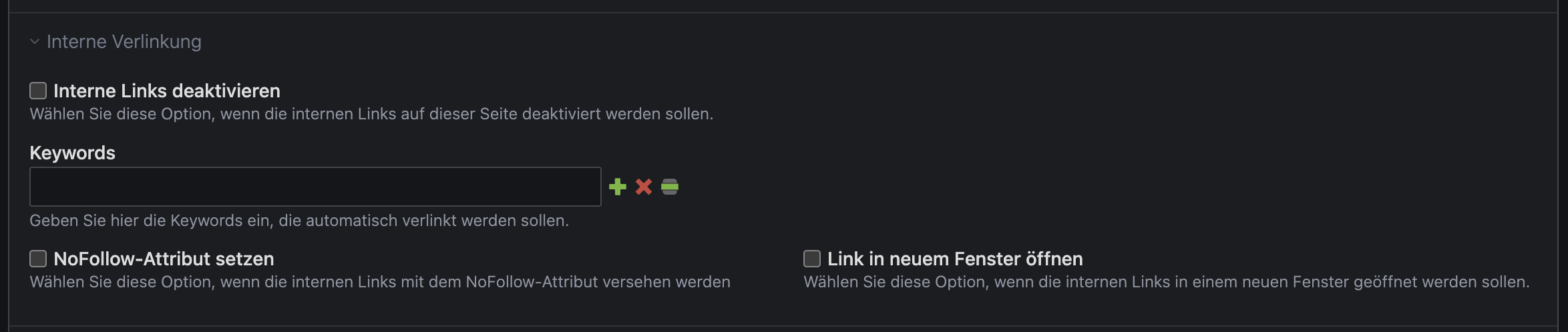 Seiten, News und andere Inhalte können mit Keywords versehen werden, die, sobald sie auf anderen Seiten vorkommen, automatisch verlinkt werden.