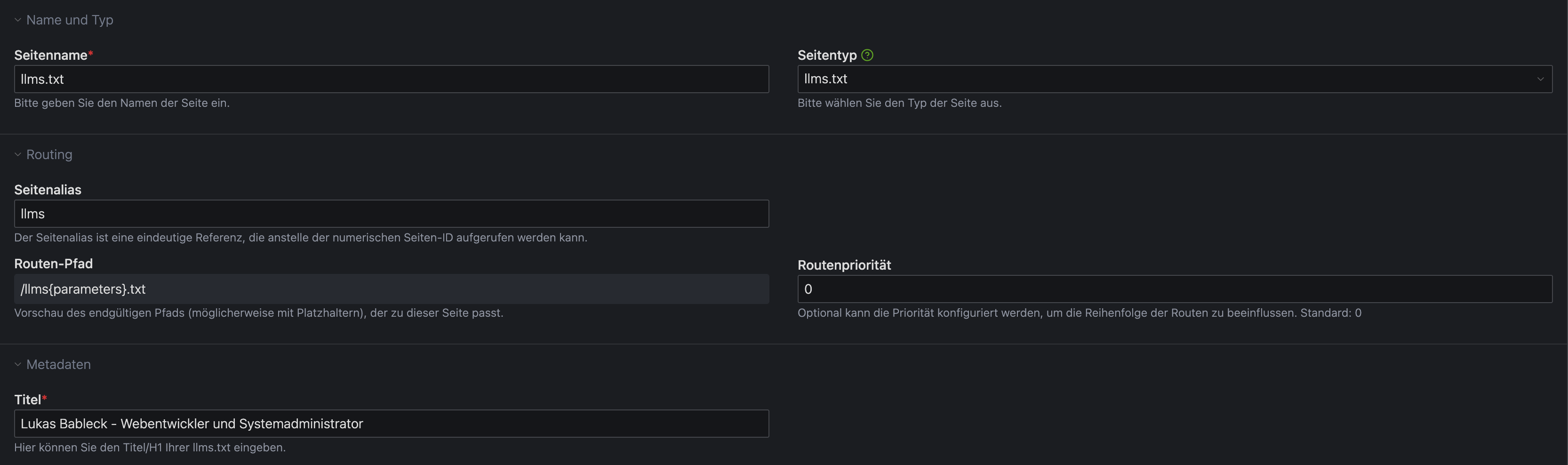Mit dieser Erweiterung ist es möglich eine LLMS.txt im Contao Backend als Seite zu erstellen und mit speziellen Inhaltselementen zu befüllen.