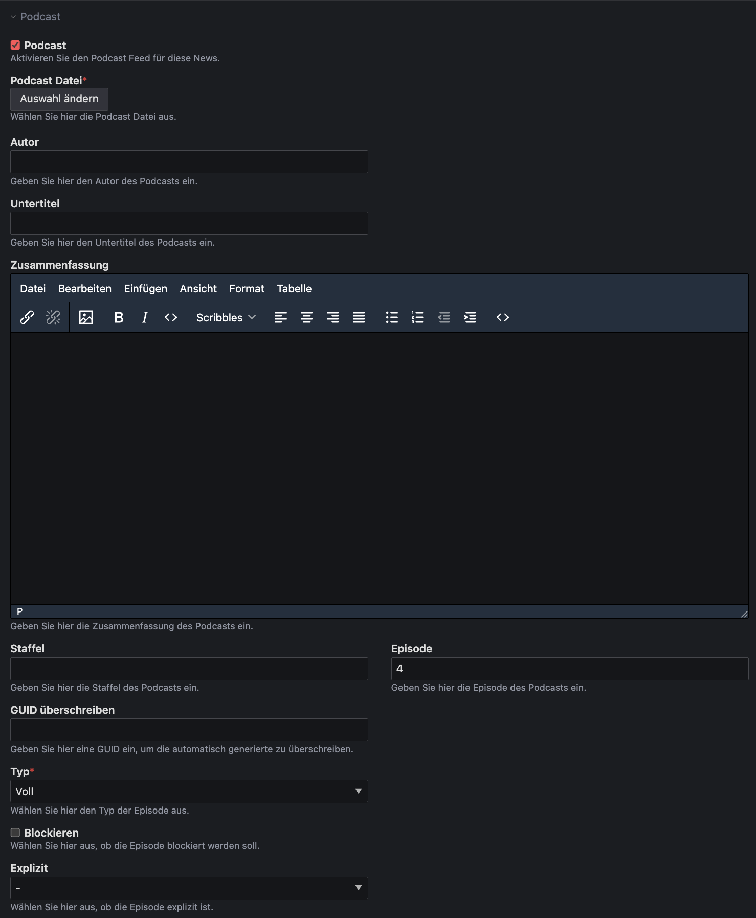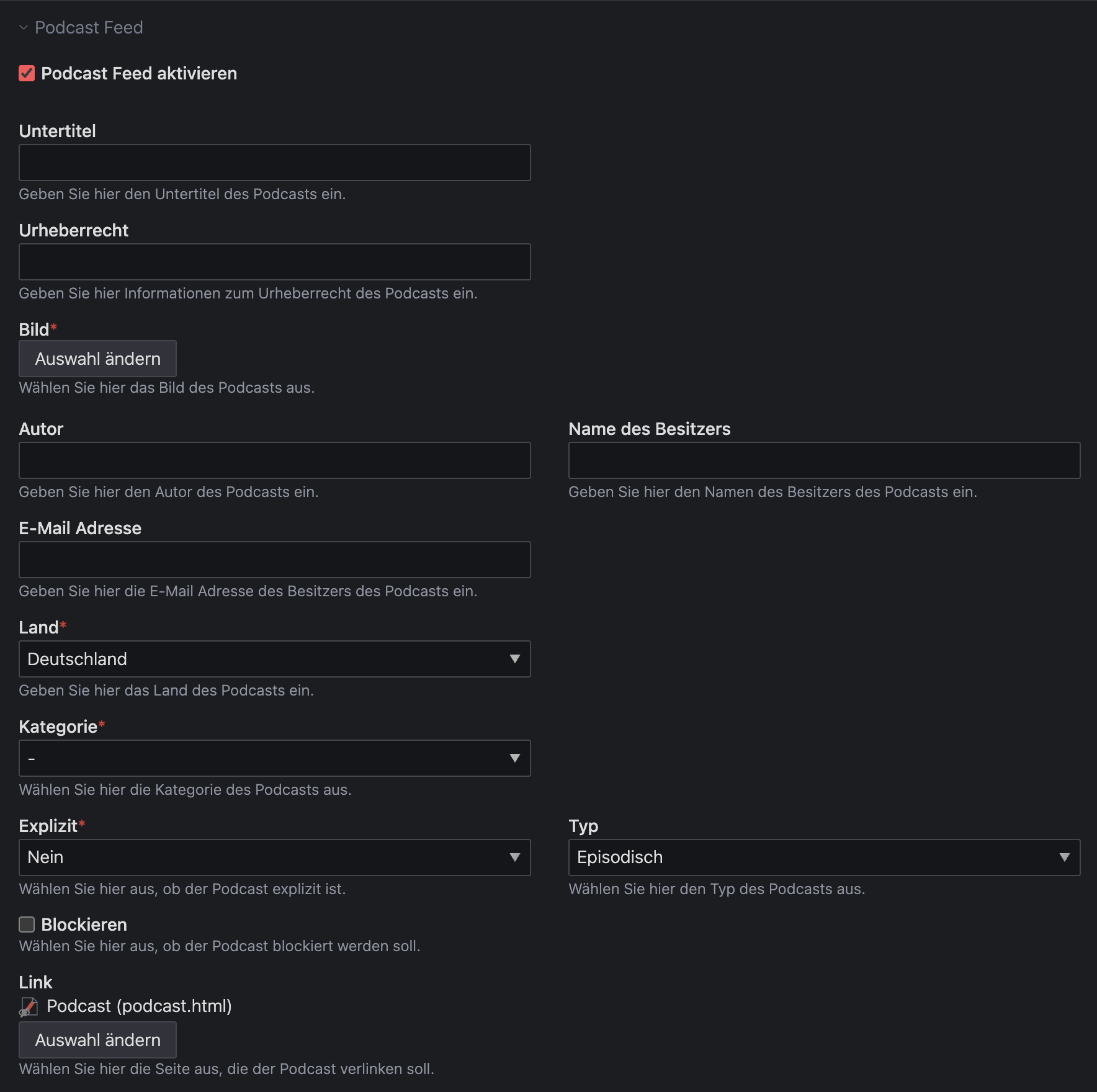 Diese Erweiterung fügt zusätzliche Felder zu der Contao News Erweiterung hinzu, die für einen Podcast XML Feed notwendig sind.
